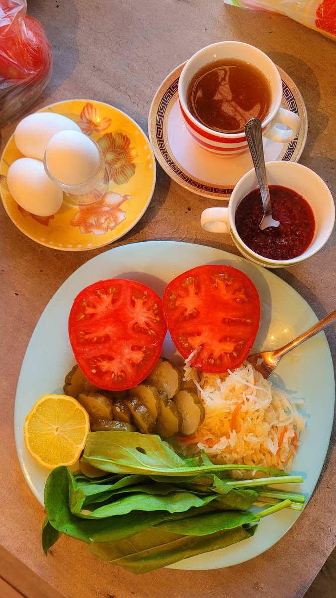 Сегодня обед из Гонконгской кухни - ,,Оздоравливающий,,. Витаминный салат с квашеной капустой и яйца в смятку 👌 Ну и ромашковый чай по колхозному с малиновым вареньем и имбирем тоже не повредит 😊 Всем приятного аппетита, делитесь под постом в комментариях своими обедами и ужинами. А какими блюдами вы лечились от Гонконгского гриппа? 👍 🍇🍒🥗🫕🥘🍜🥮🍮🍰 Подпишитесь друзья @derevenskiyzakolhoz