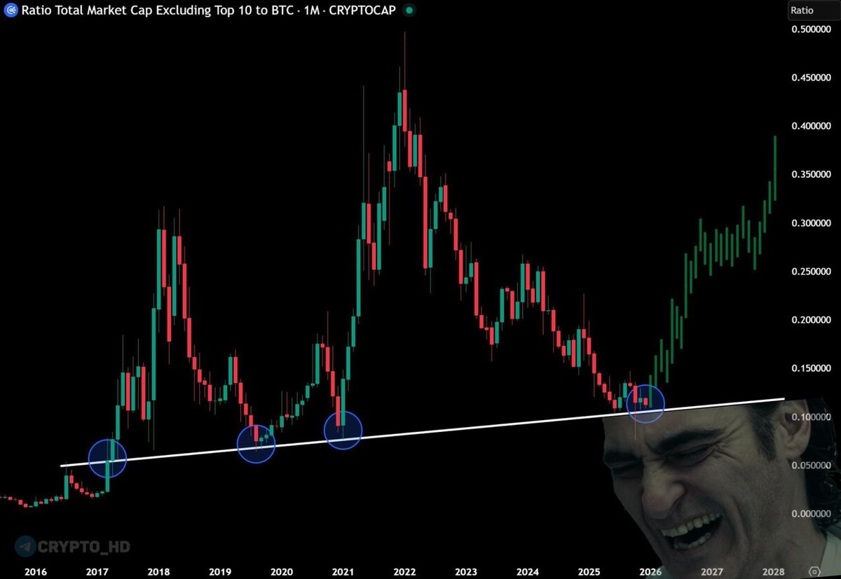 🔴 В X набирают популярность подобные графики, указывающие на неизбежное начало альтсезона…В самое ближайшее время.