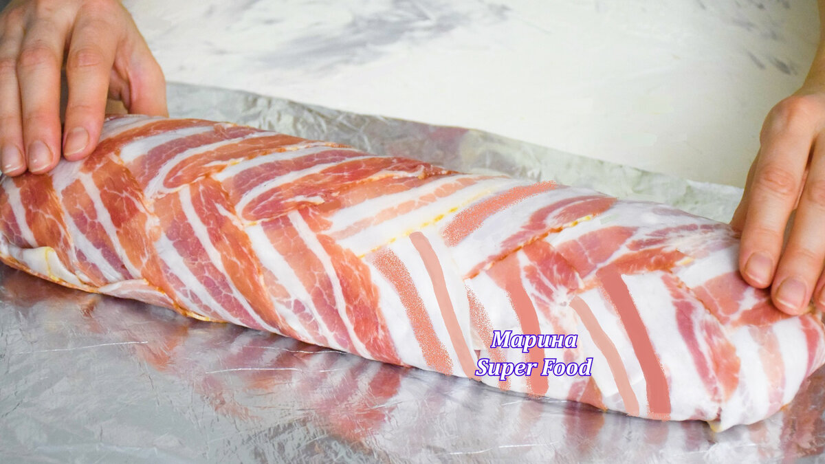 Всем привет!! Предлагаю удачный рецепт праздничной закуски - приготовим "Полосатый" рулет с начинкой. Аппетитный, сочный и ароматный: его однозначно оценят все. ПРОДУКТЫ ДЛЯ РЕЦЕПТА ВЫ НАЙДЁТЕ В КОНЦЕ ЭТОЙ СТАТЬИ. 1. Репчатый лук нарезаем на кубики. Шампиньоны нарезаем на ломтики. Обжариваем лук и грибы на растительном масле до полной готовности. 2. Морковь натираем на крупной тёрке. Разогреваем масло на сковороде и обжариваем морковь до готовности. Из мяса свинины (у меня окорок) сделать фарш. Свинину можно заменить на филе бедра курицы. Добавляем 1 яйцо, соль и черный молотый перец по вкусу. Вливаем сливки любой жирности (или молоко). Все перемешиваем. 3. Выкладываем фарш на пакет, распределяем его в прямоугольник 30 х 40 см. Сверху выкладываем и разравниваем обжаренную морковь, затем грибы с луком, не доходя до края 10 см. 4. Сворачиваем все это в плотный рулет. Раскладываем вот так полоски внахлест друг на друга. Перекладываем рулет на середину полосок. 5. Закрываем полосками беко
