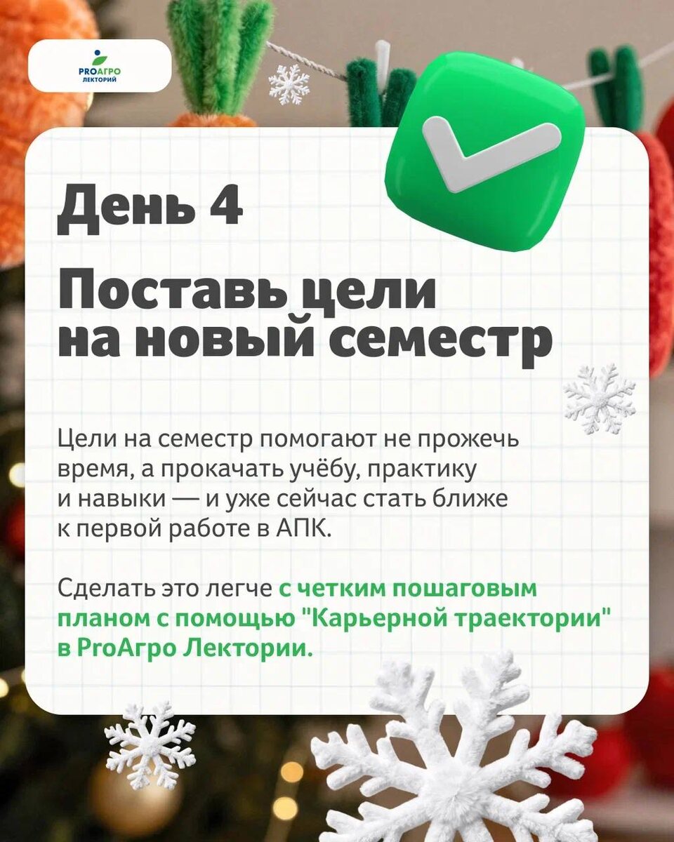 Продолжаем открывать следующее окошко нашего мини-адвента подготовки к новому семестру. Сегодня говорим про цели — не формальные «планы», а короткие ориентиры, которые реально помогают не теряться в учёбе и понимать, куда двигаться дальше. Что заложить в цели: 1️⃣Учёба. Какие предметы хочешь подтянуть? 2️⃣Практика. В какую компанию хочешь попасть в 2026? 3️⃣Конкурсы/конференции. Где хочешь себя попробовать? 4️⃣Хард-скилл. Какой профнавык прокачаешь первым? 5️⃣Софт-скилл. Публичные выступления, команда, время — что в приоритете? Чтобы понять, какие цели подходят именно тебе, загляни в Карьерную траекторию на ProАгро Лектории — она помогает собрать всё в понятный маршрут: от сегодняшнего уровня до профессии, к которой хочешь прийти. ⛸Построй свою карьерную траекторию на 2026 год