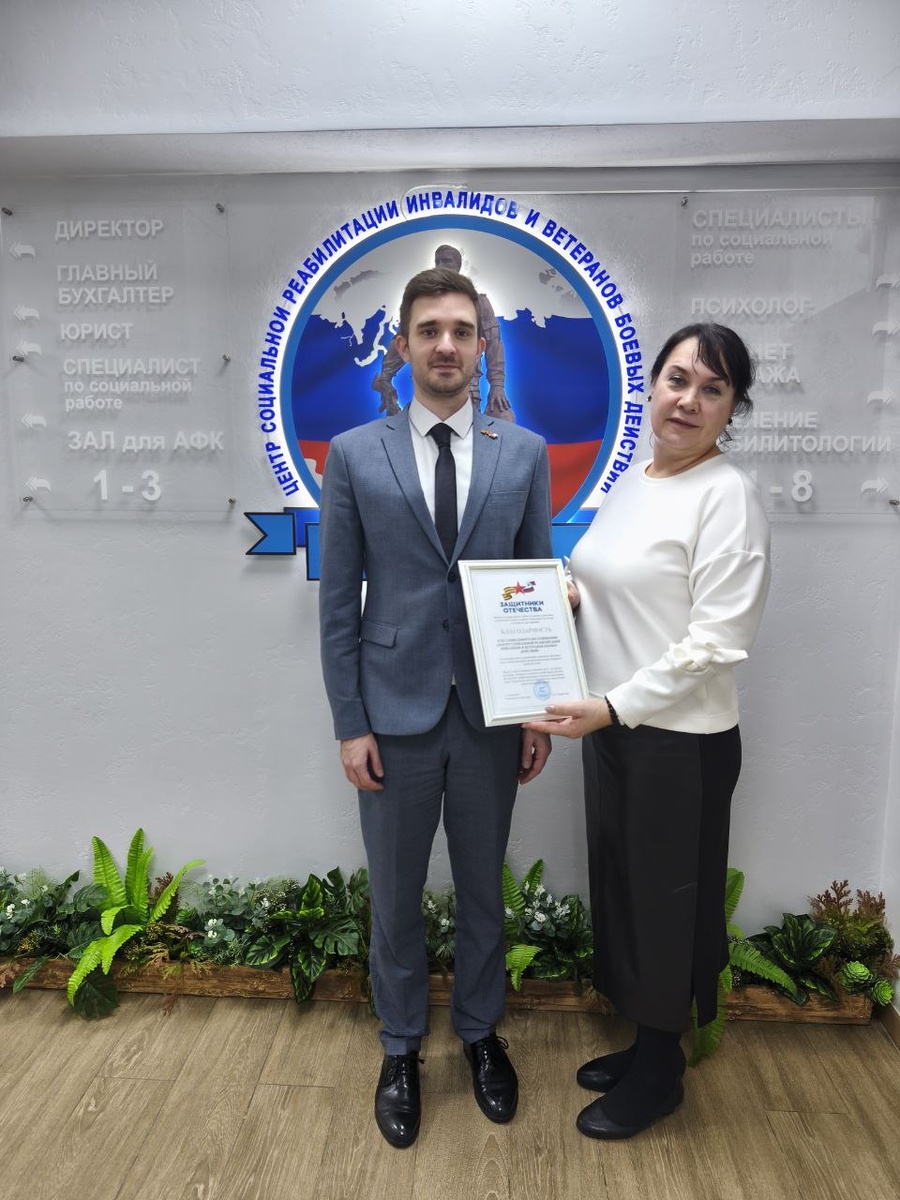 Коллектив Центра социальной реабилитации инвалидов и ветеранов боевых действий был отмечен Благодарностью филиала Государственного фонда поддержки участников специальной военной операции "Защитники Отечества" в Алтайском крае за сотрудничество и организацию городского фестиваля спорта среди участников СВО и членов их семей. Сотрудники Центра ВБД тесно взаимодействуют с социальными координаторами Госфонда "Защитники Отечества" при оказании помощи, поддержки участников СВО и членов их семей, проводят совместные социально-значимые мероприятия. Мы и в дальнейшем будем сотрудничать и реализовывать новые совместные планы с филиалом Государственного фонда поддержки участников специальной военной операции "Защитники Отечества" в Алтайском крае.