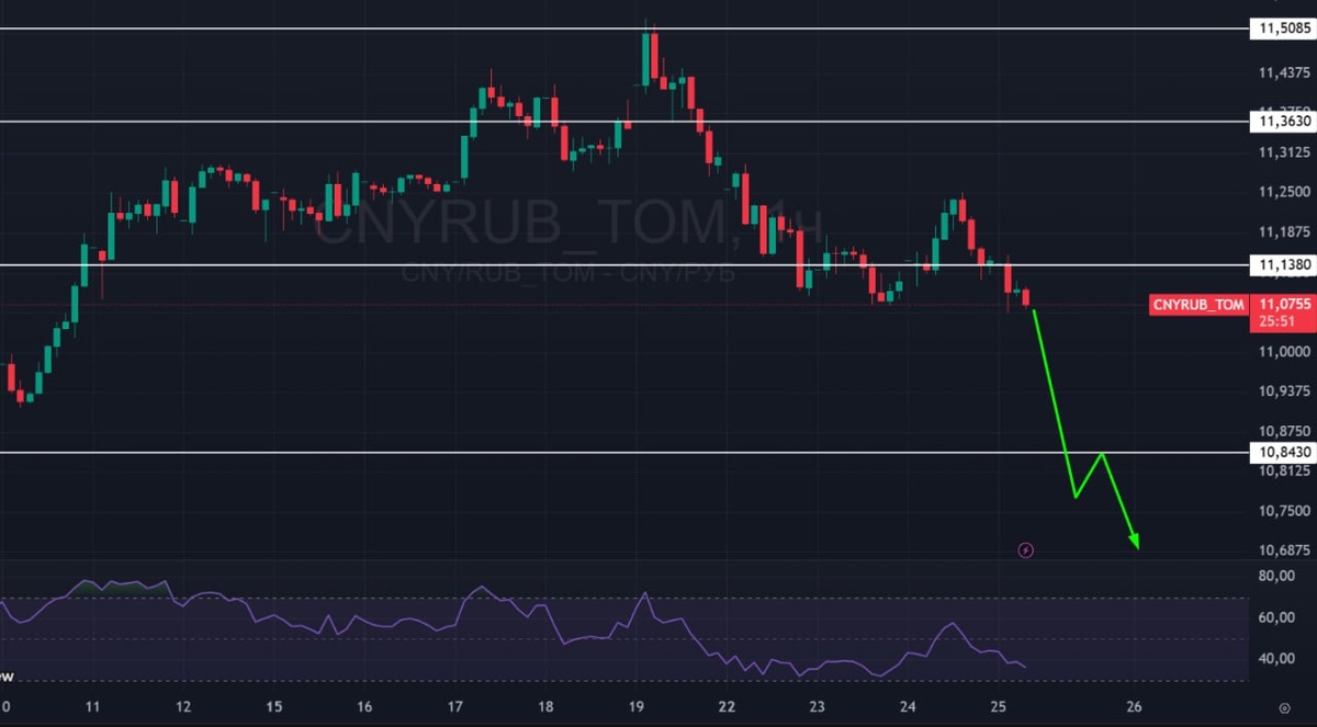 🔤 Юань-Рубль 🟢С момента последнего поста про юань мы уже пролетели поддержку 11,1380. В ожиданиях ничего не изменилось: жду ниже, на 10,80, и потом еще ниже. Причины всё те же: ©️ЦБ + Минфин ежедневно продают валюту ©️Инфляционные ожидания высокие ©️Инфляция не побеждена *️⃣Налоговый период (временный фактор) *️⃣Приход нерезов на спец счета типа ИН (не известно приходят ли они, но если да, то это фактов в пользу укрепления рубля) 🟢Локально обновляем соседние минимумы и идем сдувать спекулятивный рост. Что примечательно, на самом хае. выше 11,50 огромное кол-во блогеров трейдеров поверило, что началась та самая девальвация рубля, так что на самом хае застряло много лонгустов, примерно они полопаются на 10% ниже текущих значений. 🚗 Продолжаю ждать укрепление рубля. Идеально будет, если на какой-то геополитической позитивной новости рубль быстро укрепят до 10,20, а индекс отправят на 3100. После достижения 10,20 по юаню буду ждать масштабную сильную девальвацию рубля, возможно, на