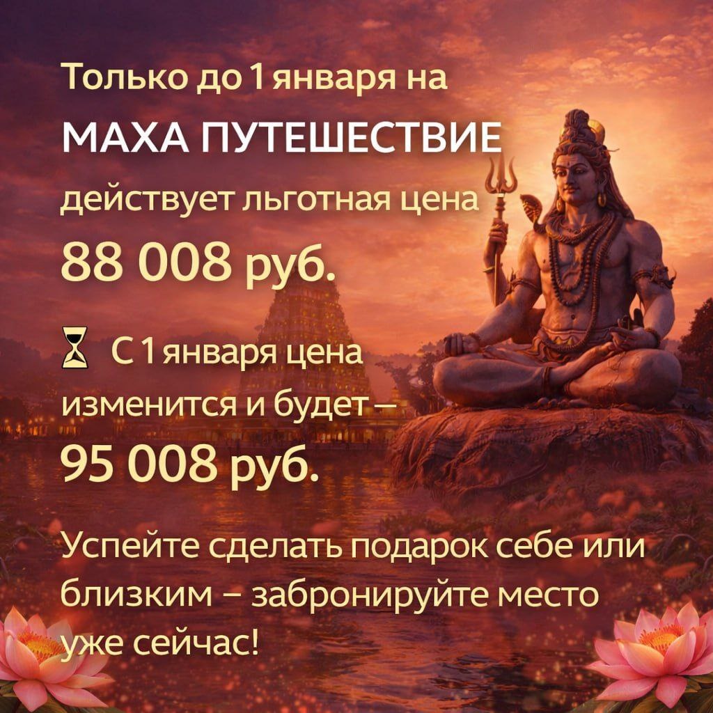 ! 💳 Мои дорогие 🤍 Иногда самый ценный подарок — это путь, который меняет состояние, взгляд и жизнь. ✨ До 1 января на МАХА ПУТЕШЕСТВИЕ действует льготная цена — 88 008 руб. Это возможность осознанно и с любовью подарить себе или близким не вещь, а опыт, который остаётся навсегда. ⏳ С 1 января цена изменится и будет такой же, как на предыдущий тур — 95 008 руб. Без возврата к прежним условиям. ✈️ До путешествия остаётся всего полтора месяца (даты тура 13-25 февраля) ... ❗️ Полтора месяца, возможно до самого важного путешествия в вашей жизни. 🌙 Находиться в Индии в ночь Махашиваратри🔱 — это особое благословение, которое выпадает не каждому. Это ночь глубинной трансформации, силы и перехода, и вы можете позволить себе эту благость, эту блажь души — быть там, где энергия говорит громче слов. Если вы чувствуете отклик — доверяйте этому ощущению. Иногда решение, принятое в моменте по зову сердца, становится началом новой жизни. 👉 Зафиксировать льготную цену можно, внеся предоплат