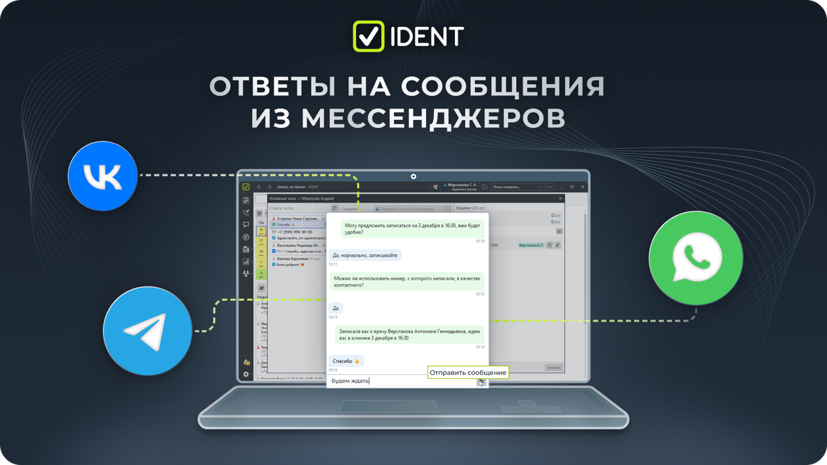 В новой версии мы сделали уникальную возможность отвечать на сообщения из мессенджеров прямо в окне «Активные чаты». 😱💥 Интеграция с мессенджерами набирает обороты — теперь переписка с пациентами и контроль за ней стали ещё удобнее! Ваши администраторы будут в восторге: ✅Моментальные ответы на вопросы пациентов из IDENT, не переключаясь между мессенджерами – все в одном окне! ✅Синхронизация чатов в реальном времени и автоматическая загрузка новых сообщений – больше не нужно обновлять страницу, чтобы увидеть, ответил ли вам пациент. ✅Никаких забытых чатов – все новые сообщения будут выделяться индикатором 📌Тем временем для директора все остается в лучших традициях IDENT: история чатов сохраняется в карточке пациента, вы легко отслеживаете диалоги, анализируете конверсию и держите руку на пульсе.