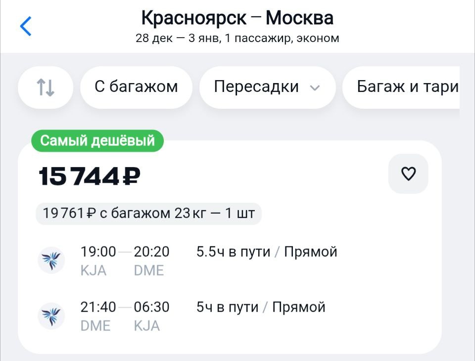 Даты - самый пик. От 15700₽ ↔️ без багажа https://aviasales.tpm.lv/XFqOooWN Петербург вообще новогодний - от 17000₽ ↔️ https://aviasales.tpm.lv/2qijbtDc @KJA