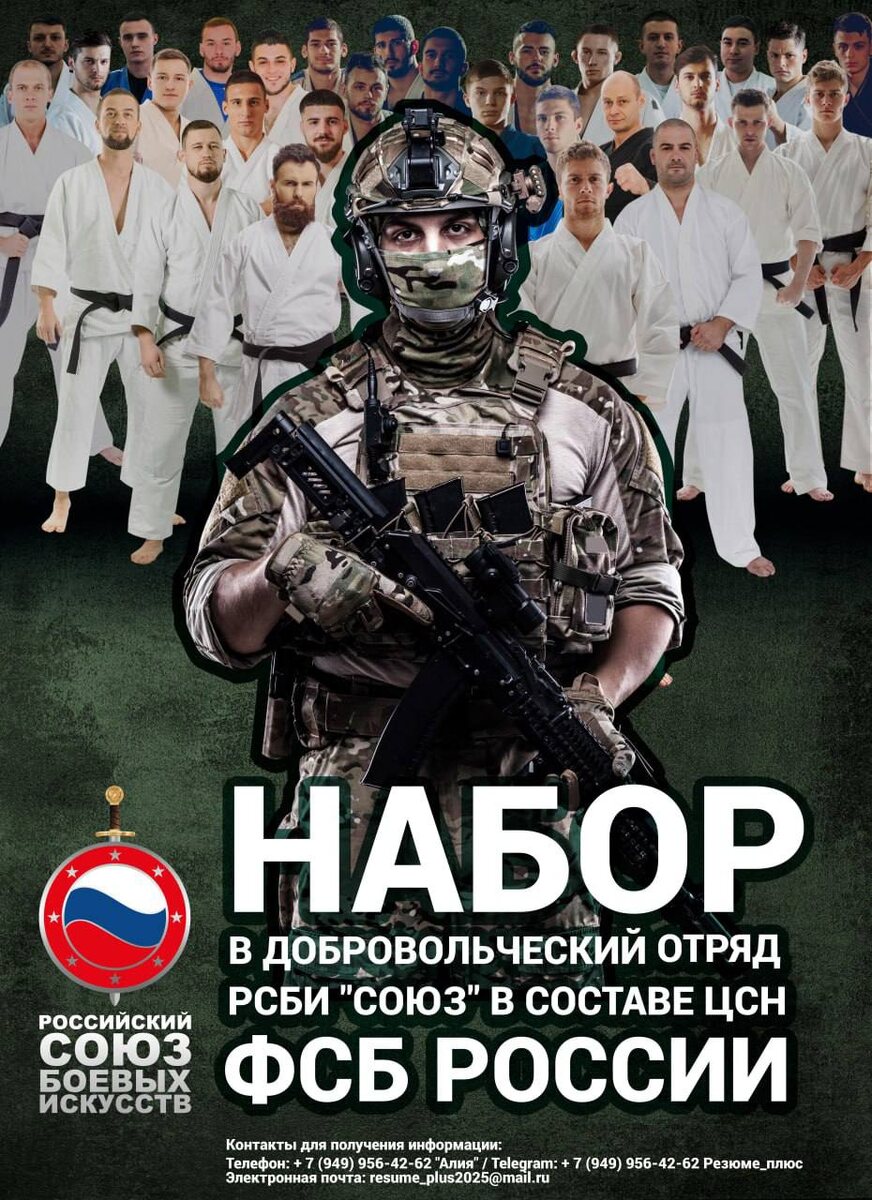 ! Согласно поручению Сопредседателей РСБИ на отчётно-выборной Конференции РСБИ объявлен дополнительный набор на военную службу в состав добровольческого отряда РСБИ «СОЮЗ» из представителей федераций – членов РСБИ. С начала 2024 года отряд «СОЮЗ» в составе подразделения Специального Назначения ФСБ России выполняет задачи по обеспечению безопасности должностных лиц и особо важных объектов государственной собственности, а также выполняет служебно-боевые задачи в рамках оперативных мероприятий на территориях Запорожской и Курской областей, Донецкой Народной Республики. Контактные данные для резюме в эл. виде: resume_plus2025@mail.ru Telegram +7 (949) 956-42-62, моб. номер +7 (949) 956-42-62 УСЛОВИЯ СЛУЖБЫ И ТРЕБОВАНИЯ К КАНДИДАТАМ по ссылке: https://disk.yandex.ru/i/kZtTTPsRlvO3FQ
