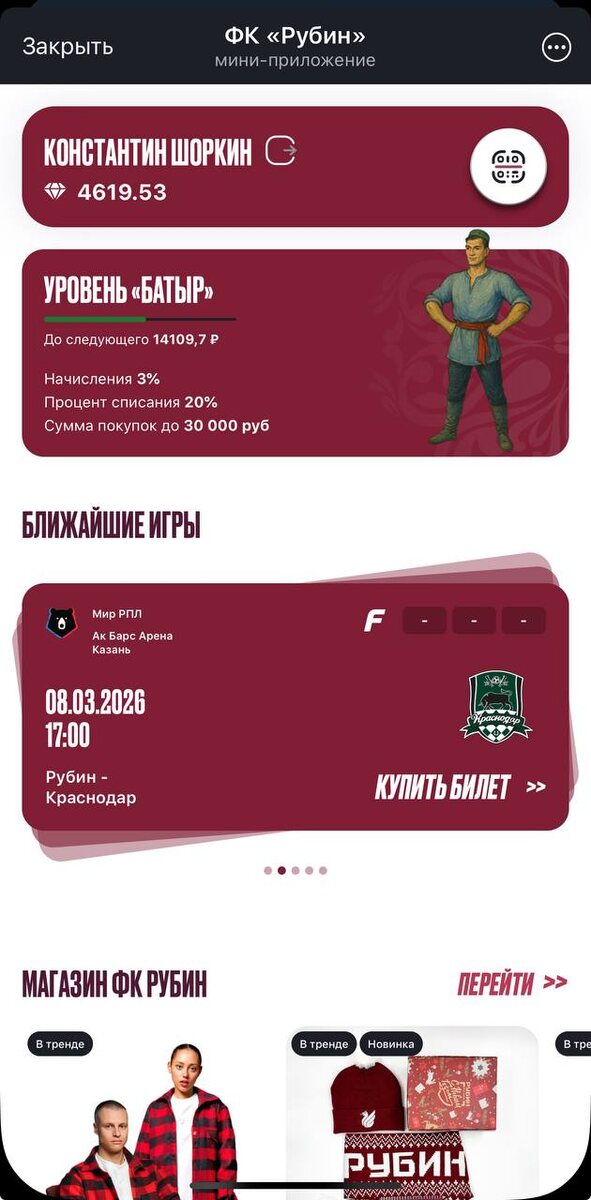 ! ⚽️ Одна из привилегий канала Спортивный маркетолог – возможность штурмить идеи с экспертами. Расскажем, как это помогло нашему клубу. Еще летом мы с Артемом (автором канала) непринужденно обсуждали перспективы Telegram, ботов и приложений. Пришли к мысли, что потенциал – огромный: геймификация, лояльность, продажи, статистика и спонсорские интеграции. Все это можно поместить в любимой телеге. Сказано – сделано. Мы запустили официальное мини-приложение в Telegram – @fcrubin_bot. Собрали здесь самые необходимые сервисы клуба: от личного кабинета до фан-шопа и билетов на матчи. Интересно ваше мнение об этом продукте.
