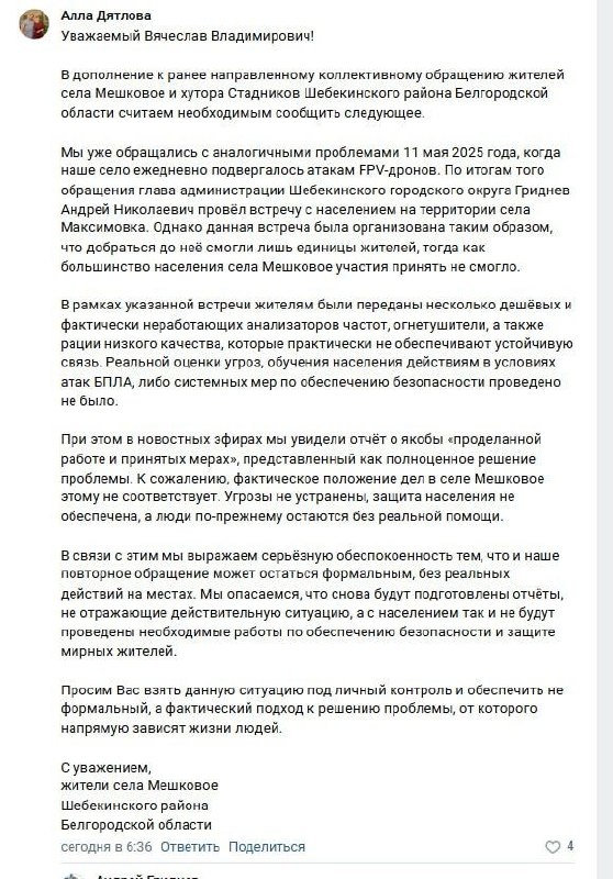 Это подтверждают сообщения, поступающие от людей, проживающих в селе Мешковое, а также на хуторах Стадников и Бабенков. Для оказания помощи местному населению рассматривается вариант временного переезда из этих населённых пунктов с дальнейшей компенсацией затрат на съёмное жильё. Данная инициатива будет представлена для обсуждения на предстоящем совещании регионального оперативного штаба. ______________ 🦁 Белгородский край