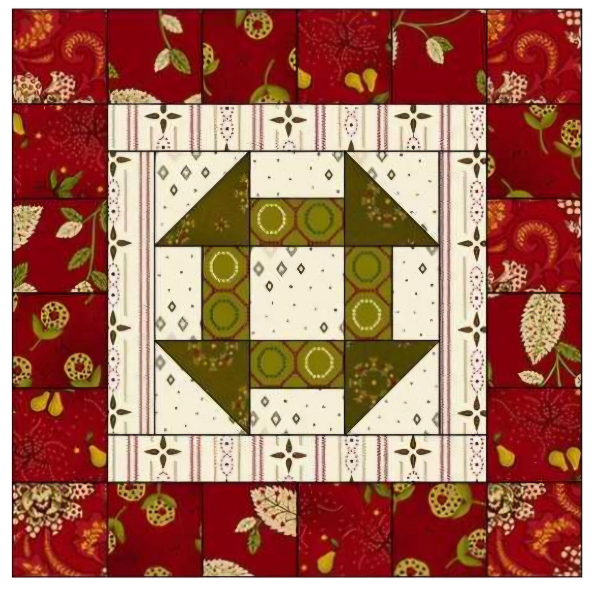 · Разложить 3 ряда для центрального квадрата согласно схеме и ряды сшить. Размер детали 6 1/2" х 6 1/2".