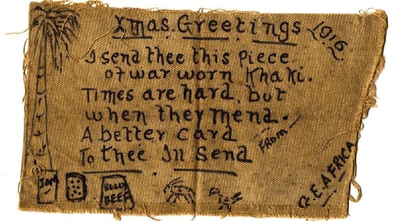25 декабря 2025 Рождественская открытка от британского солдата, Германская Восточная Африка, 1916 год. Рождественские поздравления. "Посылаю тебе кусок военной формы цвета хаки. Времена тяжелые, но когда они улучшатся, я пришлю тебе открытку получше."