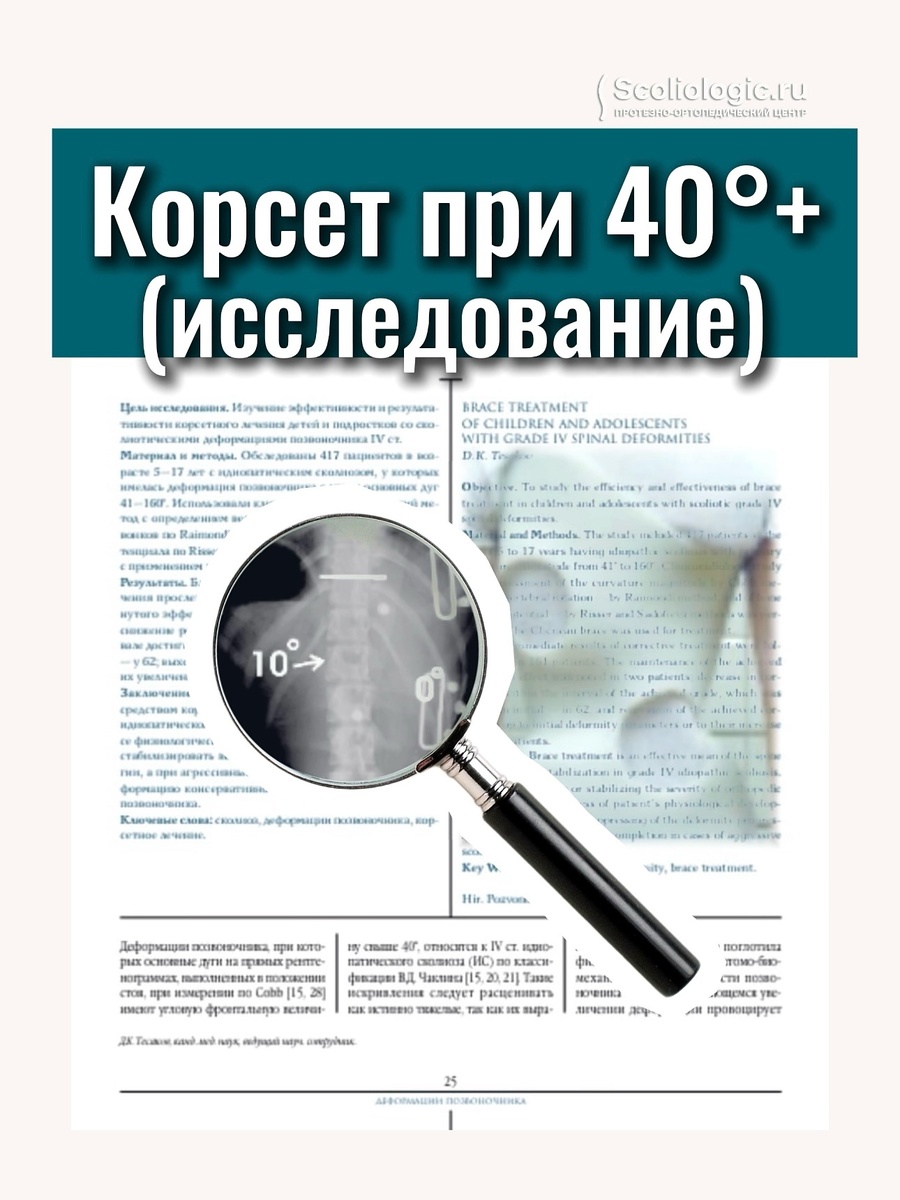 Есть работа главного внештатного детского травматолога-ортопеда Министерства здравоохранения Республики Беларусь Дмитрия Кимовича Тесакова (2010), посвящённая корсетотерапии при идиопатическом сколиозе IV степени (в данной классификации — деформации свыше 40°).