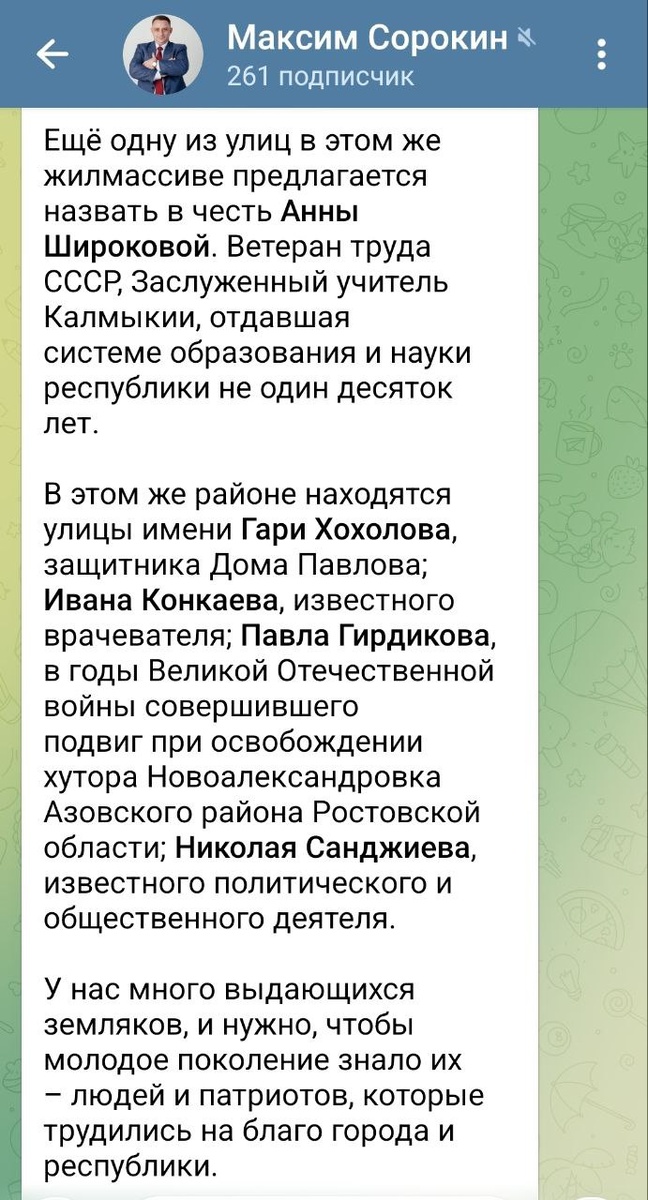 Сегодня депутаты Элистинского городского Собрания проголосовали "За" присвоение одной из новых улиц в городе Элиста имени Анны Алексеевны Широковой - Ветерана труда СССР, Заслуженного учителя Республики Калмыкия. Мы - сын, внучки, правнучка, снохи, родственники Доржиновы и Широковы, друзья и земляки нашей мамы, бабушки и прабабушки БЛАГОДАРИМ ВСЕХ ЗА УВЕКОВЕЧЕНИЕ ПАМЯТИ ЭТОГО СВЕТЛОГО ЧЕЛОВЕКА! Пусть у вас все будет хорошо! А будущим жителям улицы имени Анны Широковой - благополучия и благоденствия!