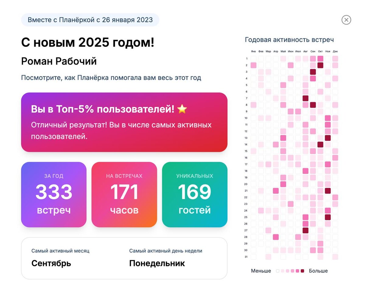 Наш менеджер был уверен, что он самый активный пользователь Планёрки. Но, как выяснилось, статистика показывает иначе 😅 Респект тем, кто с нами делится чудесами (c): 👉 Экспертам, щедро делящимся опытом 👉 Менторам, которые задают вектор роста 👉 Коучам, которые вдохновляют найти ответы 👉 Психологам — нашим хранителям здравомыслия 👉 Маркетологам, которые проводят опросы и узнают потребности клиентов 👉 HR-ам, которые собеседуют всех и не сходят с ума 👉 Консультантам, которые готовы помочь даже во сне ✨ Хотите узнать свою статистику за год? Посмотрите, сколько встреч вы провели, сколько уникальных гостей пригласили и как росла ваша активность: https://planerka.app/events На компьютере смотрится особенно эффектно, но и с телефона тоже отлично. С наступающим Новым годом! Пусть 2025-й будет ещё продуктивнее 🎅