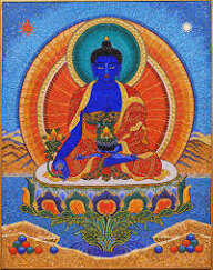 Будду Медицины по-другому называют Бхайшаджьягуру Вайдурьяпрабхараджа, что в переводе с санскрита означает «Исцеляющий Учитель Лазуритового Сияния». В Тибете верят, что искреннему человеку достаточно одного прикосновения к его изображению для того, чтобы исцелиться. В Ведах описано, как Будда Медицины подарил людям Четыре Тантры Исцеления.