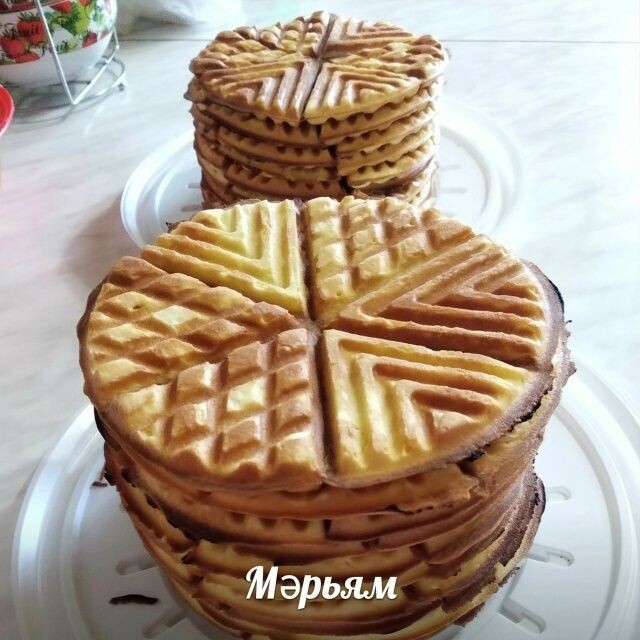 Кирәк булачак: 4 йомырка белән бер стакан тулыр тулмас песок, чеметеп кенә тоз салып яхшылап болгатабыз, шуңа 1 аш калагы каймак кушабыз, 1 пачка эретелгән маргарин яки ак май, он, 1 чәй калагы разрыхлитель кушабыз. Камыр каймак куелыгында килеп чыгарга тиеш. Махсус печенье табасын алдан кыздырып майлап пешерәбез.