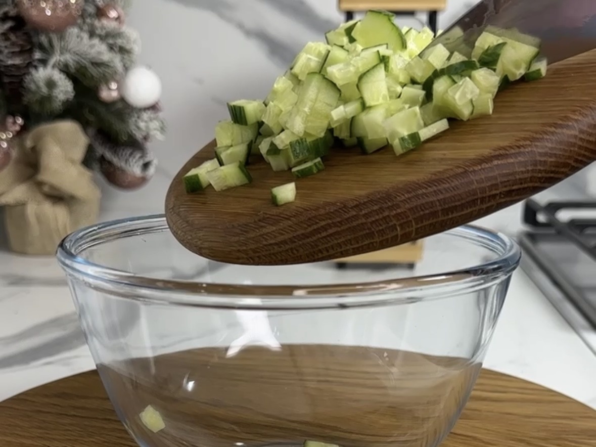 Начинаю со свежего огурца. Нарезаю его мелкими кубиками. Огурец здесь играет важную роль, он даёт сочность и свежесть, поэтому лучше брать именно свежий, а не маринованный.
