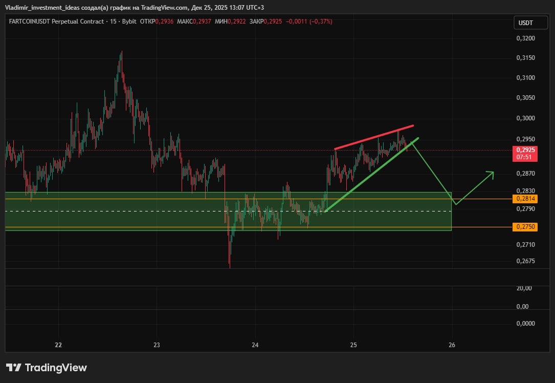 Обратите внимание на #FARTCOIN можно 1й вариант, шорт до оранжевых данных и стоп за хай, или лонг пробовать от указанных уровней со стопом в районе 0.2690)