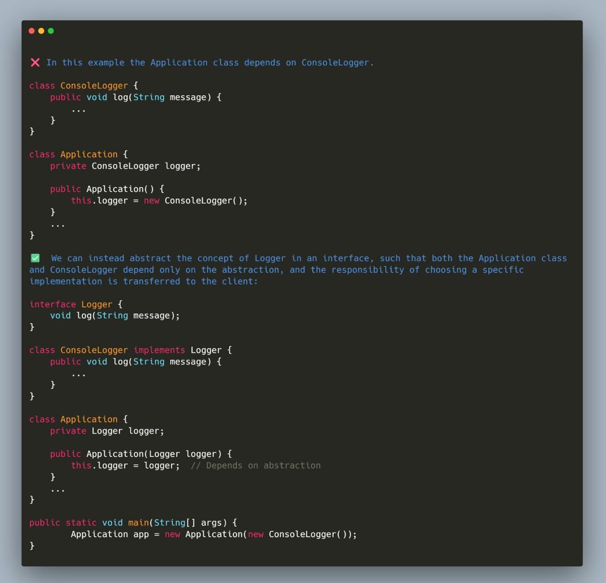 β Π ΠΏΠ΅ΡΠ²ΠΎΠΉ Π²Π΅ΡΡΠΈΠΈ Application Π½Π°ΠΏΡΡΠΌΡΡ ΡΠΎΠ·Π΄Π°ΡΡ ConsoleLogger. ΠΡΠΎ ΠΆΡΡΡΠΊΠ°Ρ ΡΠ²ΡΠ·ΠΊΠ°: ΠΊΠ»Π°ΡΡ Π½Π΅Π²ΠΎΠ·ΠΌΠΎΠΆΠ½ΠΎ ΠΏΠ΅ΡΠ΅ΠΈΡΠΏΠΎΠ»ΡΠ·ΠΎΠ²Π°ΡΡ Ρ Π΄ΡΡΠ³ΠΈΠΌ ΡΠΈΠΏΠΎΠΌ Π»ΠΎΠ³Π³Π΅ΡΠ°. βοΈ Π ΠΏΡΠ°Π²ΠΈΠ»ΡΠ½ΠΎΠΉ Π²Π΅ΡΡΠΈΠΈ Π²Π²ΠΎΠ΄ΠΈΡΡΡ ΠΈΠ½ΡΠ΅ΡΡΠ΅ΠΉΡ Logger. Π Application Π·Π°Π²ΠΈΡΠΈΡ Π½Π΅ ΠΎΡ ΠΊΠΎΠ½ΠΊΡΠ΅ΡΠ½ΠΎΠ³ΠΎ ΠΊΠ»Π°ΡΡΠ°, Π° ΠΎΡ Π°Π±ΡΡΡΠ°ΠΊΡΠΈΠΈ - ΠΈ Π»ΠΎΠ³Π³Π΅Ρ ΠΏΠ΅ΡΠ΅Π΄Π°ΡΡΡΡ ΠΈΠ·Π²Π½Π΅. ΠΡΠΎ ΠΏΡΠΈΠ½ΡΠΈΠΏ ΠΈΠ½Π²Π΅ΡΡΠΈΠΈ Π·Π°Π²ΠΈΡΠΈΠΌΠΎΡΡΠ΅ΠΉ Π² Π΄Π΅ΠΉΡΡΠ²ΠΈΠΈ: ΠΊΠ»ΠΈΠ΅Π½Ρ Π²ΡΠ±ΠΈΡΠ°Π΅Ρ ΡΠ΅Π°Π»ΠΈΠ·Π°ΡΠΈΡ, Π° ΠΏΡΠΈΠ»ΠΎΠΆΠ΅Π½ΠΈΠ΅ ΠΎΡΡΠ°ΡΡΡΡ Π³ΠΈΠ±ΠΊΠΈΠΌ ΠΈ ΡΠ°ΡΡΠΈΡΡΠ΅ΠΌΡΠΌ. @javarush