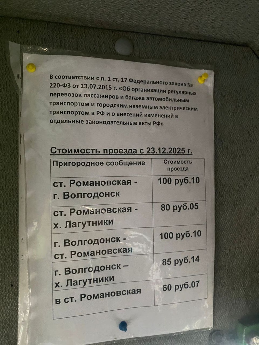 С 23 декабря в Волгодонске вступили в силу новые тарифы на пригородные маршруты до станицы Романовской. Стоимость проезда от города до Романовской увеличилась с 90 до 100 рублей. Также изменились цены на другие маршруты: поездка из Волгодонска в Лагутники теперь стоит 85 рублей, а между Лагутниками и Романовской — 80 рублей. Путешествие внутри самой станицы Романовской обойдётся пассажирам в 60 рублей — один из самых высоких сельских тарифов в регионе. В автобусах новые цены на билетах указаны с точностью до копеек, хотя на оплату всё равно принимают целые рубли. Местные жители и пассажиры делятся своим мнением о возросших ценах на пригородный транспорт. ВЕСТНИК ВОЛГОДОНСКА