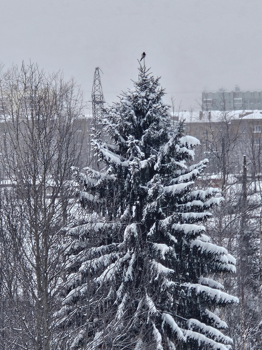 К чему эта ель снежная с нахохлившимся представителем вороньего рода на острие макушки?