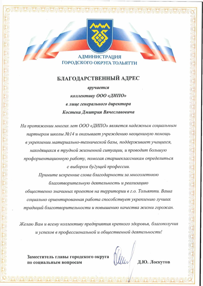 ! Коллектив ООО «ДИПО» награжден БЛАГОДАРСТВЕННЫМ ПИСЬМОМ от Администрации г.о. Тольятти! На протяжении многих лет мы шефствуем над школой №14, оказывая неоценимую помощь: • Укрепляем материально-техническую базу учреждения • Поддерживаем учащихся в трудной жизненной ситуации • Проводим профориентационную работу, помогая старшеклассникам выбрать профессию. Это признание нашей деятельности и общественно значимых проектов в Тольятти! Спасибо школе №14 за теплые слова и доверие. Вместе делаем город лучше ❤️