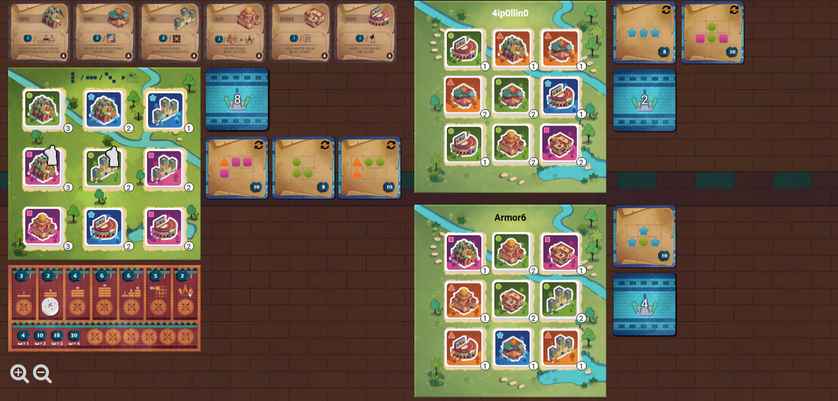 Сыграли вчера с Арсением на Boardgamearena (онлайн платформа с цифровыми версиями настольных игр). Первой игрой стала Архитекторы Амитис. Да, я много писал про эту игру, даже два раза в топ месяца попадала. Плюс, не поленился видеообзор сделать. Классная дуэльная игрушка, тайл плейсмент + крестики-нолики. Вы берете тайлы с рынка 3 на 3 и размещаете на своем планшете тоже 3 на 3. На планшет рынка выставляете архитектора там, где взяли тайл. Тайлы представляют собой здания, которые по различным критериям дают ПО. Если вы выставляете на рынке трех архитекторов ортогонально или диагонально, вы можете выставить фишку на одну из ячеек планшета благосклонности царя. Это различные бонусы, за которые вы получите ПО в конце игры. Также есть карты проектов. Их можно выполнять, выставив цвета тайлов в определенном порядке. ПО за проекты даются в конце игры. Когда мы доиграли, я опережал Арсения примерно на 20 ПО. Но он выполнил намного больше проектов. И вот после подсчета проектов счет стал 121: