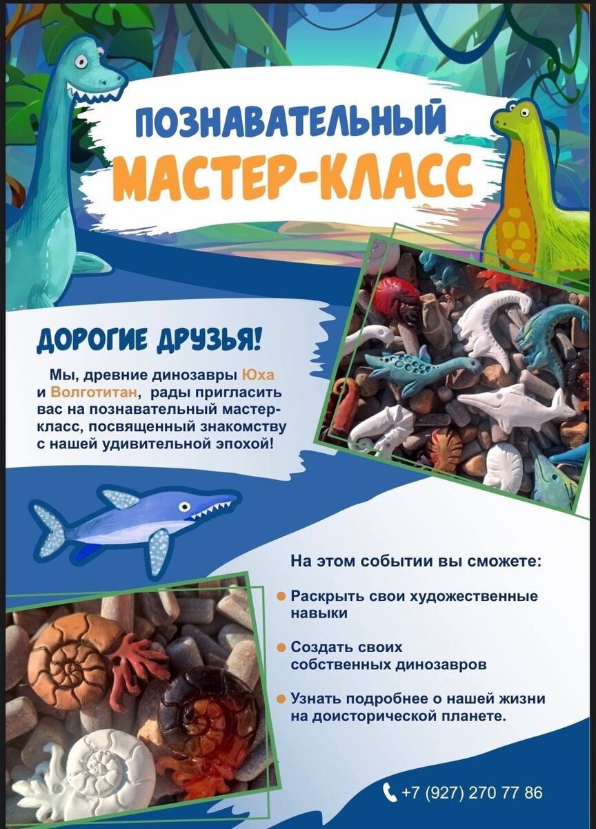 » 🦖 🗓️ 28 декабря 18:00* 📍переулок Мира, 24 В программе: ▪️Создание авторского динозавра. ▪️Увлекательные истории о динозаврах Ульяновской области. ▪️Сувенир каждому — магнит с динозавром! ▪️Развиваем творчество, моторику и любовь к истории родного края. Мастер-класс рассчитан на юных исследователей от 1-го до 8-го класса 🌸 🏷️ 350₽/чел. 📞Запись: +79272707786 *при наборе группы возможна запись на другой день #28декабря25@culturnik