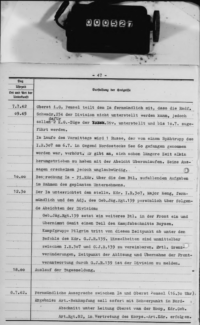 В первой половине дня был допрошен русский, взятый в плен 6 июля разведгруппой 307-го пехотного полка в районе северо-восточной оконечности озера 60. Он показал, что бродит уже длительное время, так как замыслил перебежать. Но его показания не выглядят убедительно.