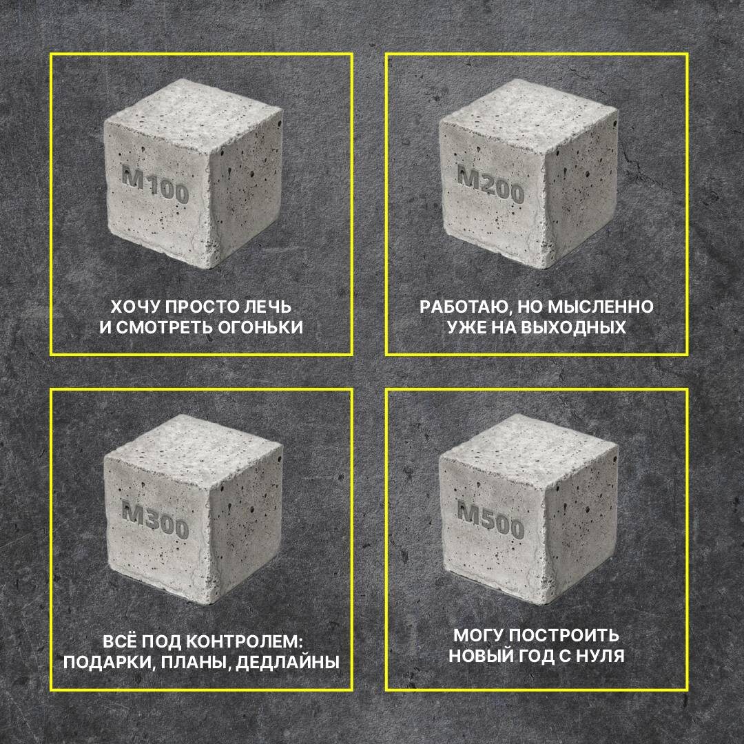 Кто-то уже в гирляндах и мандаринах, а кто-то всё ещё держит стройку под контролем! 😄 Мы решили перевести предновогодние эмоции на бетонный язык. Пишите свою «марку» в комментариях. Посмотрим, кого в декабре больше!