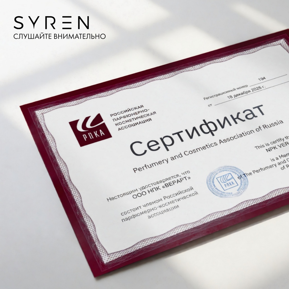 Дорогие друзья, хотим сообщить вам прекрасную новость – мы стали полноправным членом Российской Парфюмерно-Косметической Ассоциации! SYREN выводит свой научный подход на отраслевой уровень, чтобы вместе с лидерами рынка создавать новые стандарты качества и безопасности. 💬Ключевые направления нашего участия в РПКА: • Развитие нормативной базы — Мы делимся экспертизой в химии композиций для совершенствования технических регламентов и создания благоприятной регуляторной среды. • Доступ к уникальным знаниям — Используем базу данных РПКА по ингредиентам для создания еще более инновационных и безопасных формул, гарантируя стабильность и предсказуемость аромата. • Поддержка локального производства — Участвуем в программах по развитию отечественных ингредиентов и производств, укрепляя независимость и качество российской парфюмерии. • Экспортный потенциал — Вместе с ассоциацией работаем над укреплением имиджа российских ароматов на мировом рынке, открывая новые возможности для наших клиенто