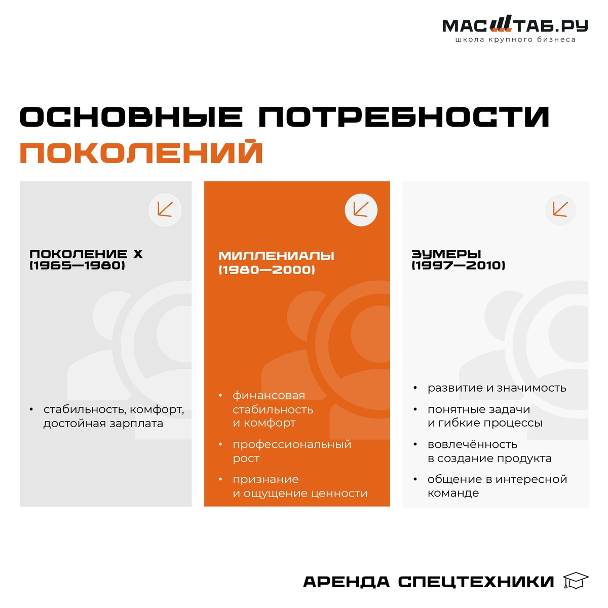 Друзья, какие основные потребности должна закрывать мотивация персонала в бизнесе аренды спецтехники и оборудования? Рассмотрим основные: Поколение X (1965г.р.-1980г.р.): 1) хорошо зарабатывать; 2) ощущать стабильность и комфорт; Миллениалы (1980г.р.- 2000г.р.): 1) хорошо зарабатывать; 2) ощущать стабильность и комфорт; 3) расти как профессионал; 4) чувствовать, что тебя ценят; Зумеры (1997г.р.- 2010г.р.): 1) расти как профессионал; 2) чувствовать, что тебя ценят; 3) работать с простыми и понятными задачами; 4) организовывать и улучшать процессы; 5) делать что-то полезное и значимое; 6) общаться с приятными и интересными людьми. Каждая группа в удовлетворении своих потребностей требует от руководства Компании создания максимально возможных условий. Кадровый дефицит способствует видоизменять подход Компании к персоналу, чтобы избежать конкретной борьбы за своих сотрудников. Если «Поколение X» не требует от Компании особого подхода ни в найме ни в своей трудовой деятельности (главное ч
