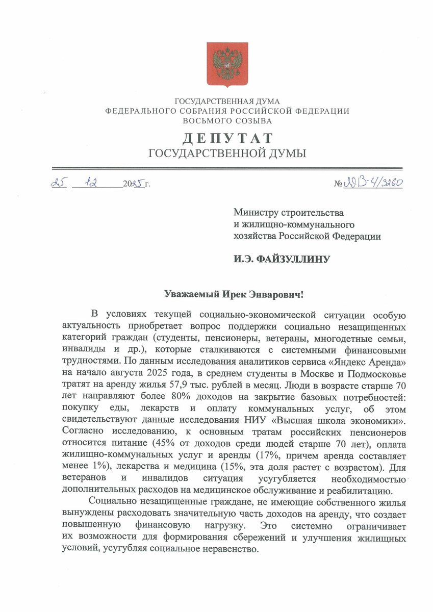предложением ввести специальный налоговый вычет на аренду жилья для социально уязвимых категорий граждан — студентов, пенсионеров, инвалидов, ветеранов и многодетных семей. 🔴Студенты в Москве и Подмосковье в среднем тратят 57,9 тыс. рублей в месяц только на аренду — это почти весь их доход. 🔴Пенсионеры старше 70 лет направляют более 80% своих доходов на базовые нужды: еду, лекарства, коммунальные услуги. 🔴Ветераны и инвалиды вынуждены нести дополнительные расходы на реабилитацию и лечение — при этом нередко арендуют жилье, так как не имеют собственного. При средней зарплате в стране около 91 тысячи рублей и стоимости квадратного метра на первичном рынке в 171 тыс. рублей, даже при идеальных условиях накопить на квартиру практически невозможно. А ключевая ставка в 16% делает ипотеку еще менее доступной. 💭Существующая система налоговых вычетов не учитывает эти реалии: 500 рублей для инвалида детства — это капля в море, а многодетные семьи, где один из родителей не трудоустроен оф