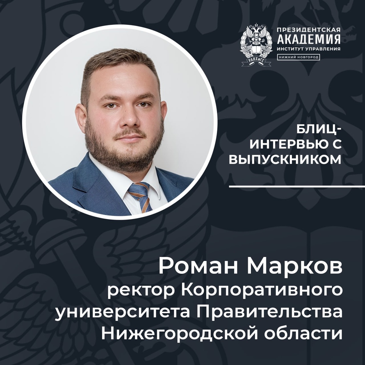 Сегодня в рубрике «Блиц-интервью с выпускником» на наши вопросы отвечает ректор Корпоративного университета Правительства Нижегородской области Роман Марков. ? Ваши самые яркие впечатления от учебы Когда впервые вошел в здание Президентской академии – тогда еще Волго-Вятской академии государственной службы, я испытал некоторое волнение. Увидев эти монументальные колонны, паркет и огромные лестницы, будто сразу почувствовал дух государственности, величия. Это произвело на меня огромное впечатление. Пожалуй, самое приятное в учёбе – это ощущение того, что ты не ограничен в выборе принятия решений. Пока учишься в школе, ты должен ходить на все уроки, наравне с остальными, и получать оценки. И желательно хорошие. А в вузе понимаешь, что можешь пропустить пару и потом наверстать самостоятельно. Или углубиться в предмет, который тебе интересен, за счет факультативов. То есть, конструировать свой образовательный процесс. По факту ты сам расставляешь приоритеты и управляешь собственной эффекти