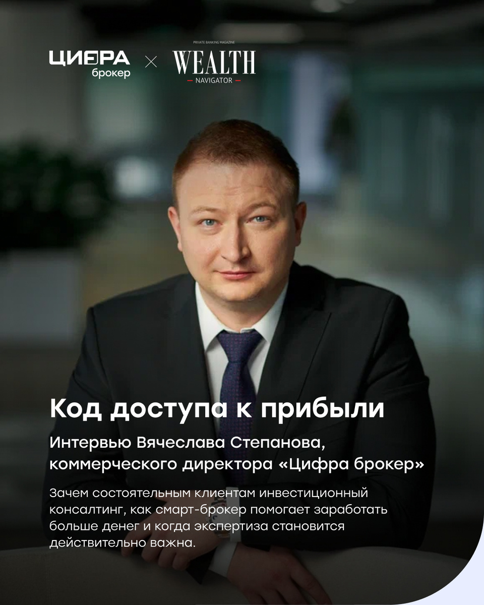Коммерческий директор «Цифра брокер» Вячеслав Степанов дал интервью журналу Wealth Navigator. В разговоре наш эксперт рассказал, зачем состоятельным инвесторам нужен инвестиционный консалтинг, какую роль играет экспертиза в управлении капиталом и как формат смарт-брокера помогает находить дополнительные точки роста доходности.