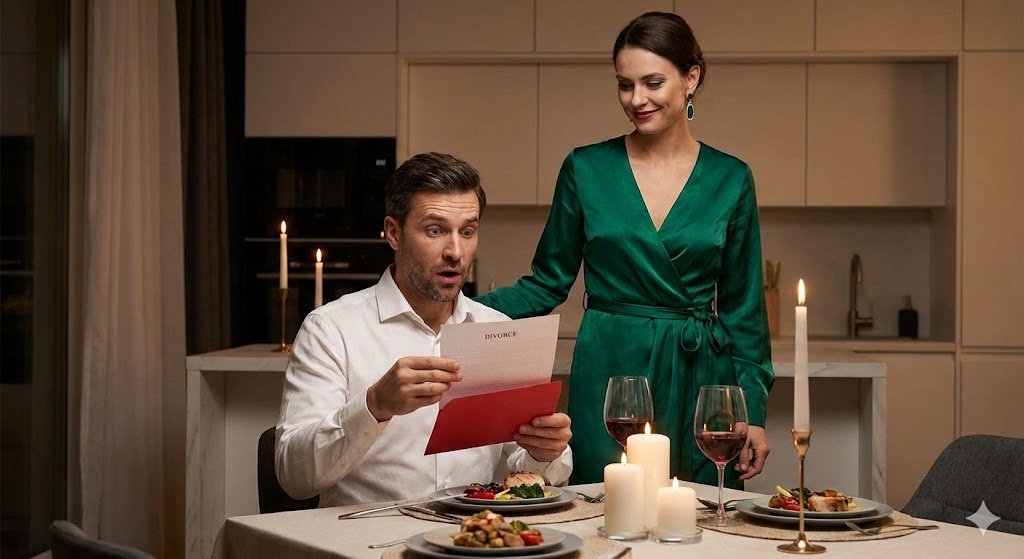 Олег вошел в гостиную, сияя, как начищенный пятак. Белая рубашка, которую я гладила ему на прошлой неделе, сидела безупречно, влажные волосы были аккуратно зачесаны назад. Он окинул взглядом стол: мерцающие свечи, запотевшая бутылка «Бароло», стейки на фарфоровых тарелках и я — в изумрудном платье, с бокалом в руке.
