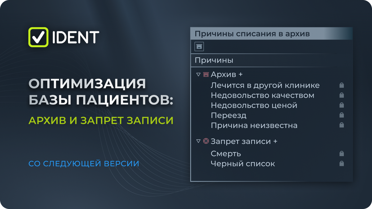 С новой версии в IDENT можно не просто отправлять пациентов в «Архив», а группировать их по причинам списания: Как выглядит обновление в программе и почему работать с базой стало проще - смотрите в карточках!💚 А попробовать все возможности IDENT, которые помогут сделать вашу работу удобнее, можно в бесплатной демоверсии