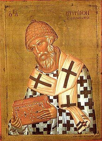 ) Па́мять и́же во святы́х отца́ на́шего и чудотво́рца Спиридо́на епи́скопа Ки́прскаго (Тримифу́нтскаго) Стихи́: Чудотво́рец, а́ще и у́мре, Спиридо́н, И́же чудоде́йствовати не оскуде́ николи́же: В осемьна́десятый Спиридо́н оста́ви житие́. Сей бя́ше в ца́рство Константи́на Вели́каго и Конста́нтия сы́на его́. Бя́ше же и нра́вом препро́ст и сми́рен се́рдцем, и бя́ше же изнача́ла па́стырь овца́м. Та́же и жене́ приобщи́вся, и по уме́ртвии же ея́ поста́влен бысть епи́скоп. Толи́ко же вдана́ бысть ему́ благода́ть чудесе́м от Бо́га, я́ко бездо́ждию бы́вшу, и дождь сведе́, и па́ки умноже́нию его́ бы́вшу, моли́твою соста́ви, и бывшаго гла́да от хлебопрода́вец разреши́, разреши́вшимся им жи́тницам. И змию́ в зла́то преложи́, и внегда́ ни́щему одолгова́вшуся, па́ки во змию́ зла́то претвори́. И ре́чная устремле́ния уста́ви. И блудни́цы прикосну́тися нань дерзну́вши, и мно́гая к ней изрече́, испове́датися и оста́витися зла́го обы́чая сотвори́. И е́же слове́с му́дрствующих в Нике́йстем собо́ре си́л