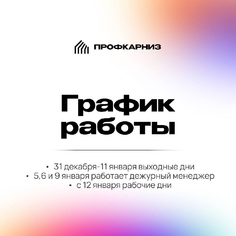 ! Информируем вас о нашем графике работы в январе. Заявки на консультацию и установку карнизов и штор можно оставлять каждый день на нашем сайте. Полноценно мы начнём работать с 12 января. При этом 5, 6 и 9 января с 10:00 до 19:00 на связи будет дежурный менеджер, чтобы оперативно помочь вам в возникающих вопросах. 8-800-100-18-66 prof-karniz.ru