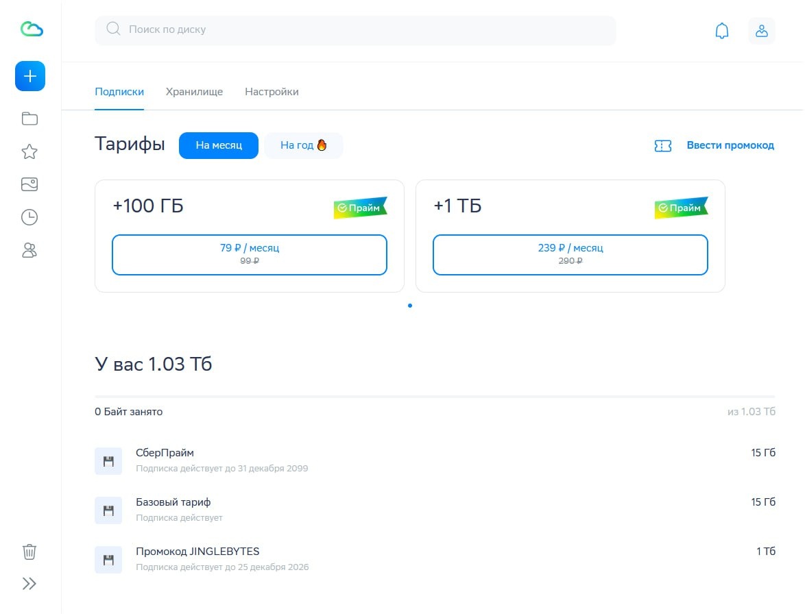 🎁 Прокомод JINGLEBYTES нужно ввести СберДиск в поле "Ввести промокод" после входа по СберID. Как итог получаем 1ТБ в облачном хранилище от Сбера БЕСПЛАТНО на 1 год, вместо 2900₽. Особенности хранилища: 🔸 Можно включить автозагрузку из галереи 🔸Максимальный размер одного файла – 10 ГБ 🔸По истечении срока данные хранятся 60 дней. Если не купить подписку, то их удалят, а размер вернется к 15/30 ГБ.