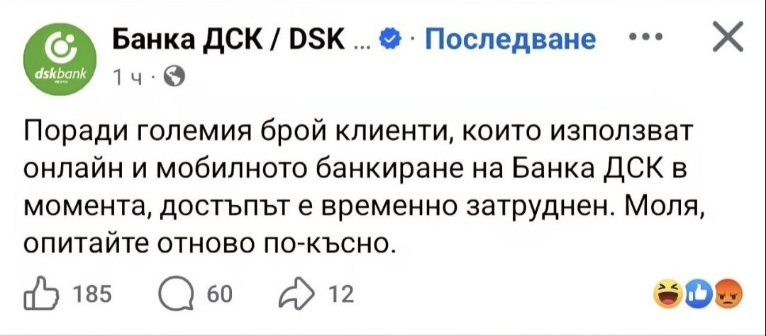 Во многих населенных пунктах Болгарии перестали работать банкоматы и онлайн приложение банка ДСК. Вот что банк сообщил в социальных сетях своим клиентам: 🔸«В связи с большим количеством клиентов, использующих онлайн и мобильный банкинг DSK Bank в данный момент доступ временно затруднен. Пожалуйста, попробуйте позже». 🔸Граждане выразили свое возмущение и поспешили напомнить, что у ДСК банка регулярно возникают технические проблемы. Вот некоторые из их комментариев: «Молодцы, вы постоянно демонстрируете свою некомпетентность» «Дело не только в приложении — ваши банкоматы в Варне покрыты листьями и не работают. И это за день до Рождества». «У вас вообще что-нибудь получается? Так бывает каждую неделю!» «Каждый год одно и то же... Как надоело» 🔸Банк подтвердил технические сбои и уточнил, что некоторые сервисы уже восстановлены. В настоящее время доступ к DSK Direct и Multicash нормализован, и клиенты могут пользоваться ими без проблем. 🔸В то же время мобильное приложение DSK Mo
