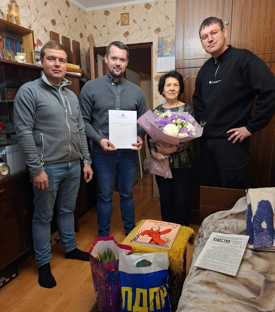 В преддверии Нового года наша дружная команда ЛДПР не могла обойти стороной тех, кто своим трудом строил наше настоящее. По поручению депутата Госдумы, координатора Московского областного отделения ЛДПР Валерия Селезнёва, депутат Мособлдумы Владимир Бутенко, исполняющий обязанности координатора местного отделения ЛДПР в городском округе Химки Фёдор Самаров и руководитель молодежной организации в регионе Николай Гладкий приехали, чтобы поздравить Валентину Петровну с наступающими праздниками и, по-человечески открыто, помочь решить трудности, с которыми порой приходится сталкиваться. Как верно отметил Владимир Бутенко: «Зарядили друг друга новогодним настроением, ведь позитив где? Только у ЛДПР!»