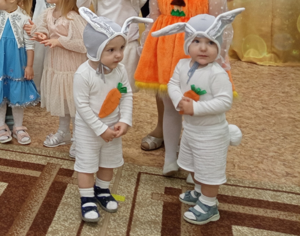 Двойняшек я отдала в сад в 1г8мес. Первый новогодний утренник был без родителей. Мальчики были зайчиками.