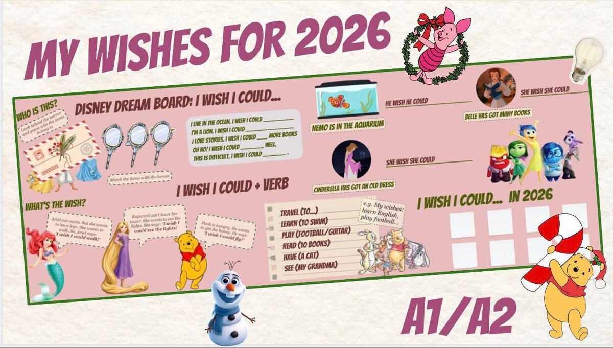 🤩🤩🤩🤩🤩🤩 Коллеги, если вы ищете идеальный урок для подведения итогов года, спокойный, тёплый и по-настоящему волшебный — он уже ждёт вас в рассылке !💗💗 🤩 My wishes for 2026 🤩 В уроке вы найдете 🤩 🤩Warm-up Угадываем героев Дисней по их личным вещам 💗 🤩Reading Читаем желания Ариель, Рапунцель и Винни Пуха💗 🤩Grammar time Изучаем конструкцию I wish I could💗 🤩Practice Закрепляем новые знания грамматики интересными заданиями с ассоциациями 💗 🤩Cool-down Загадываем свои самые заветные желания на 2026 год, используя новую грамматику 💗 Уровень: А1/А2 Формат: 💻 🌟КАК ЗАБРАТЬ🌟 Чтобы забрать всю подборку, просто переходите в бота🍁@english_with_an_bot 🍁и пишите /start 🌟🌟🌟🌟🌟🌟🌟🌟🌟🌟🌟
