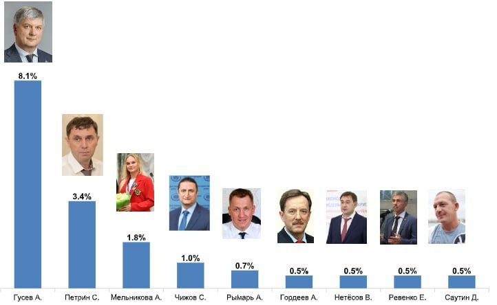 Институт общественного мнения «Квалитас» выяснил, кого из воронежских политиков, государственных и общественных деятелей, людей науки и искусства горожане считают человеком 2025 года. В ходе опроса были названы фамилии 71 человека, при этом 56 были названы по одному разу. В тоже время 53% респондентов затруднились дать содержательный ответ, а 19% опрошенных заявили, что не видят достойной кандидатуры на столь почетное звание. Соответственно, чуть меньше 30% опрошенных смогли назвать фамилию претендента на звание «Человека года». Топ-9 выглядит следующим образом: - Александр Гусев (Губернатор) – 8,1% - Сергей Петрин (Мэр) – 3,4% - Ангелина Мельникова (Олимпийская чемпионка по спортивной гимнастке) – 1,8% - Сергей Чижов (Депутат Госдумы) – 1% - Артем Рымарь (Депутат Гордумы) – 0,7% - Алексей Гордеев (Вице-спикер Госдумы) – 0,5% - Владимир Нетесов (Сенатор) – 0,5% - Евгений Ревенко (Депутат Госдумы) – 0,5% - Дмитрий Саутин (Олимпийский чемпион по прыжкам в воду) – 0,5%