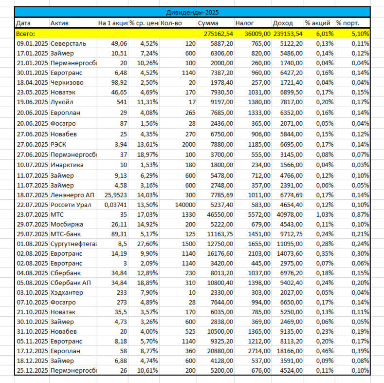 Это до налогообложения. За минусом налога на доходы - чуть более 239 тыс. рублей. Это составило около 6% моего портфеля акция на данный момент (не на начало года) или 5,1% моего общего портфеля на фондовом рынке на данный момент. А за этот год мой портфель вырос в объемах примерно в 1,5 раза. В том числе, и за счет полученных дивидендов.