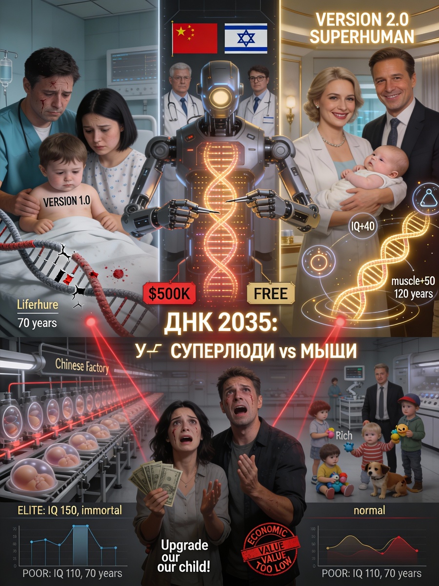 Доктор смотрит на ваш геном и говорит: "Ваш IQ 110, вы устаёте через 4 часа, рак в семье. Хотите IQ 150, энергию на 16 часов и иммунитет ко всем болезням? CRISPR + ИИ сделает это за неделю". Звучит как магия? Китай уже редактирует эмбрионы. К 2035 ИИ станет генетическим дизайнером. Богатые станут супергероями, бедные — останутся "версией 1.0". Ваши дети родятся с суперспособностями... или без них. Это не фантастика. AlphaFold 4 (Google DeepMind, 2032) предскажет все белки вашего тела. ИИ-CRISPR разрежет гены с точностью 99.9%. Ужасная правда: первый ребёнок с "дизайнерскими генами" родился в Китае в 2024. К 2035 это будет массово. И выбор будет не за вами. Китай лидирует. Их больницы уже редактируют эмбрионы: +10 IQ, -риск рака, +рост на 10 см. Правительство одобрило. Родители платят $50 000 за "улучшенного ребёнка". Капля ужаса: в Шэньчжэне тестируют массовое редактирование — армия гениев без болезней. Их солдаты будут жить 120 лет и думать в 3 раза быстрее. США: Neuralink + генетика