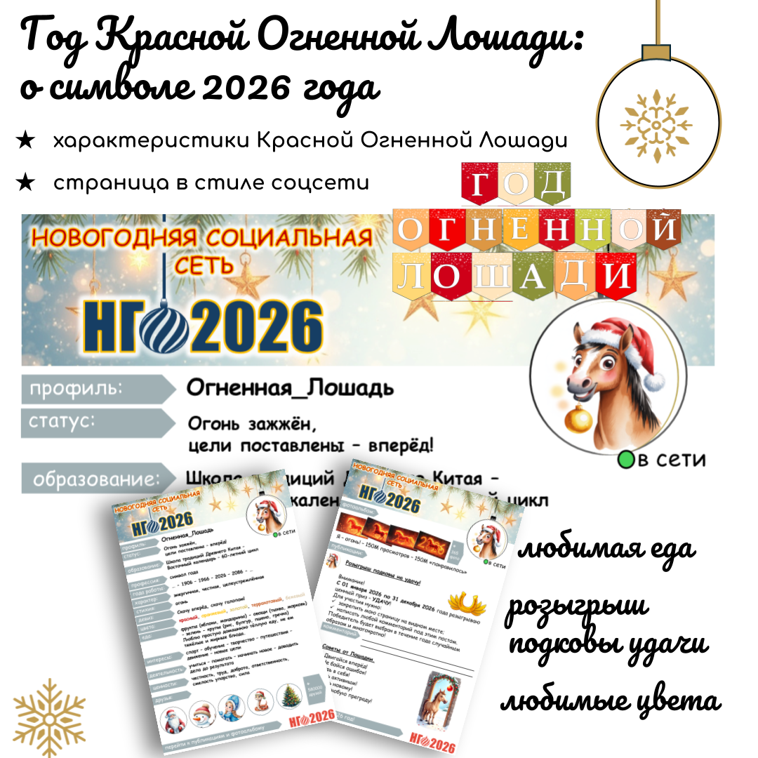 Данная разработка содержит ответы на самые популярные вопросы: что приготовить на новый год, какого цвета наряд надеть на новый год, чтобы удача Огненной Лошади благоволила в 2026 году. Все ответы даны самим символом 2026 года - Огненной Лошадью - на личной странице в новогодней социальной сети.