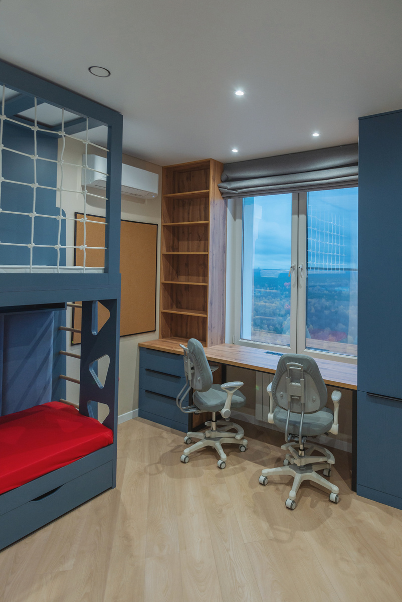 В этом проекте задача была особенно точной — встроить двухуровневую кровать в уже готовый интерьер, не нарушив стилистику и цветовой баланс комнаты. Комната предназначалась для мальчика 8 лет.