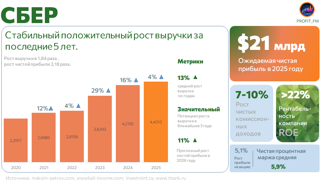 Сегодня, я начинаю серию постов «5 АКЦИЙ НАВСЕГДА». И первой из них становится – самый крупный банк России, СБЕР. СБЕР давно стал, чем-то большим, чем просто банк. Его экосистема насчитывает более 22,2 млн. подписчиков Сбер Прайма. Выручка имеет стабильный положительный рост на протяжении более пяти лет. Она выросла в 1,84 раза, средние темпы роста выручки за 5 лет составили 13,32%. Чистая прибыль выросла в 2,18 раза за пять лет. Общая клиентская база Сбера насчитывает более 110 млн. активных клиентов, что делает его безусловным лидером отрасли. По оценкам аналитиков из Т-инвестиций, в 2026 году чистая прибыль вырастет до 1,9 трлн рублей (+11% г/г). Стабильная процентная маржа на уровне 5,9% поддерживает рост процентного дохода. Рост кредитования выше рынка даже в условиях высоких ставок. Стабильные выплаты дивидендов. По данным с сайта investmint.ru прогнозная доходность будущих выплат составляет 37,28 рублей (12,3% от текущих значений). И все это «ЧУДО» за 0,75 цены балансовой стоим