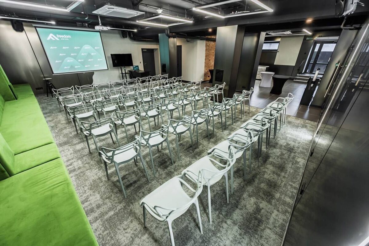 : 1. Проектор и экран 2. Кликер для презентаций 3. Микшерный пульт 4. Микрофон — 1 шт. 5. Колонки — 4 шт. 6. Флипчарт с сменной бумагой (1000₽ комплект бумаги + маркеры). 7. Телевизор 52 диагональ с стойкой(по запросу). Мебель для участников: 8. Прямоугольные столы (1200 x 600) — 10 шт. 9. Круглые столы (диаметр 1600) — 2 шт. (расчитаны на 8 человек каждый) 10. Стулья 50 шт
